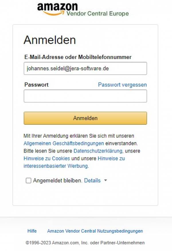 Melden Sie sich bitte mit Ihren Zugangsdaten am Portal von Amazon Vendor Central Europe über den