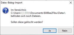 Die beiden erstellten CSV-Dateien werden nicht gezippt und liegen im Exportpfad für Sie bereit. Wenn Sie die CSV-Dateien noch einmal erstellen möchten werden Sie darauf hingewiesen, dass sich in Ihrem Export-Verzeichnis noch Dateien befinden. Sie werden gefragt ob die Dateien gelöscht werden sollen. Klicken Sie auf „nein“ wird der Erstellvorgang abgebrochen, die Schnittstelle hat nun keine neuen CSV-Dateien erstellt. Klicken Sie auf „ja“ werden die alten Dateien im Export-Verzeichnis gelöscht und durch neue ersetzt.