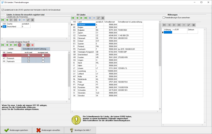 Um die entsprechenden Einstellungsmöglichkeiten an dieser Stelle zu erhalten, müssen Sie zu den Einstellungen für Setup / Fibu / EU-Länder / Fremdwährungen wechseln. Dort können Sie unter „EU Länder mit eigener Steuer-ID“ Länder anlegen. Klicken Sie auf das Plus und tragen Sie in die neue Zeile das betroffene Land ein. Bestätigen Sie Ihre Eingabe mit dem grünen Hacken.