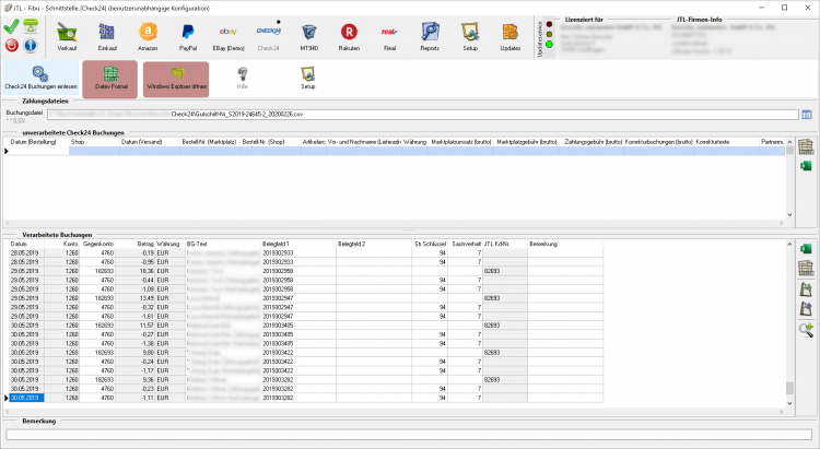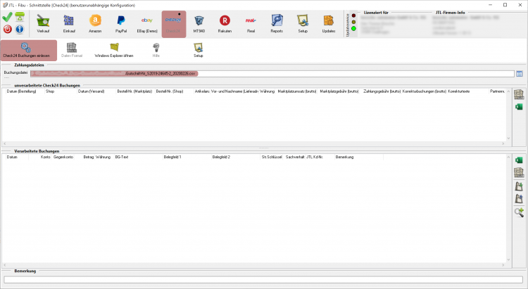 Nachdem Sie den Bericht heruntergelanden haben, wechseln Sie im Menü zu „Check24“. Tragen Sie den Pfad, unter dem Sie die .csv-Datei gespeichert haben, in das Feld „Buchungsdatei“ ein. Klicken Sie dann auf den Button „Check24 Buchungen einlesen“.