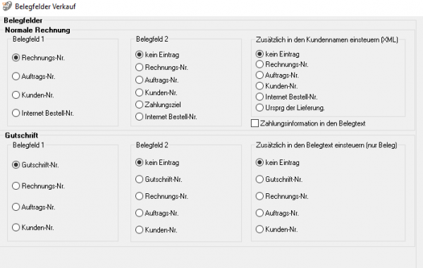 Legen Sie bitte hier den Inhalt der Belegfelder 1 und 2 fest. Außerdem können Sie verschiedene zusätzliche Informationen in den Belegtext einsteuern. Setzen Sie hierzu den Radiobutton auf den gewünschten Wert.