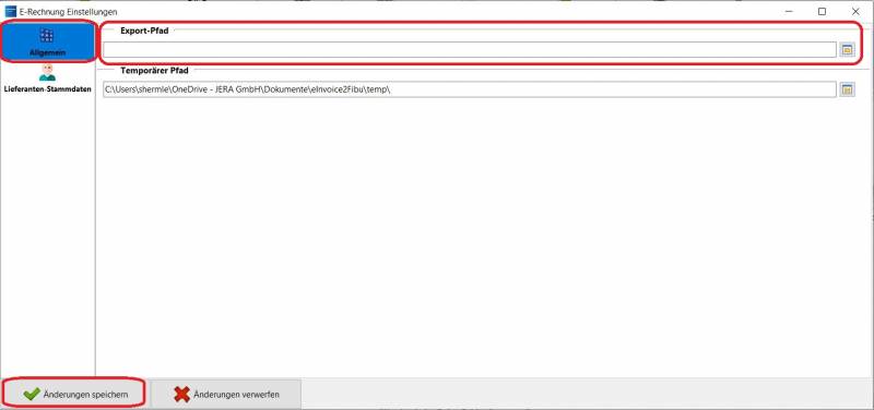 Bitte hinterlegen Sie im Reiter „Allgemein“ den Exportpfad für Ihre E-Rechnungen. Dies ist der Ort, an welchem Sie die