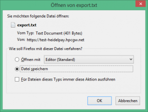 Exportieren Sie nun die gewählten Buchungen mit dem „Export“ Button und speichern Sie diese Datei auf Ihrem Rechner ab.