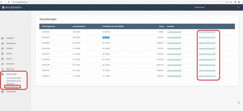 Bitte wählen Sie sich im Backend Ihres Avocadostore-Accounts ein und wechseln anschließend in den Bereich „Abrechnungen“.