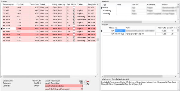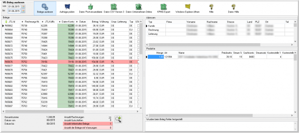 Fehlerhafte Belege werden dunkelrot angezeigt. Belege mit einer Warnung hellrot. Die Anzahl der Belege mit Fehlern und Warnungen sehen Sie unterhalb der Belege.