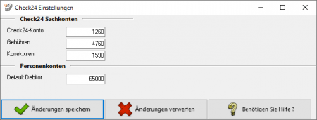 Sie können in den Sachkonten Einstellungen das Konto für die Check24 Buchungen angeben. Zusätzlich dazu können Sie noch die Konten für Gebühren und Korrekturen hinterlegen.