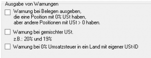 z.B. Belege die sowohl österreichische Umsatzsteuer mit 20%, als auch deutsche Umsatzsteuer mit 19% haben. - Warnung bei 0% Umsatzsteuer in ein Land mit eigener USt-ID