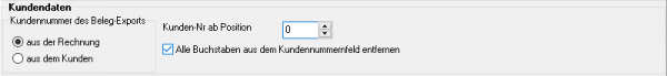 Normalerweise sind beide Kundennummern identisch. Es ist jedoch möglich, nachträglich die Kundennummer im Kundenstamm zu ändern. Hier können Sie entscheiden, welche Kundennummer die Schnittstelle für den Export berücksichtigen soll.