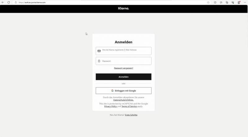 Bitte wählen Sie sich zunächst im Backend von KLARNA mit Ihren Zugangsdaten ein (vgl. Abb. 1).