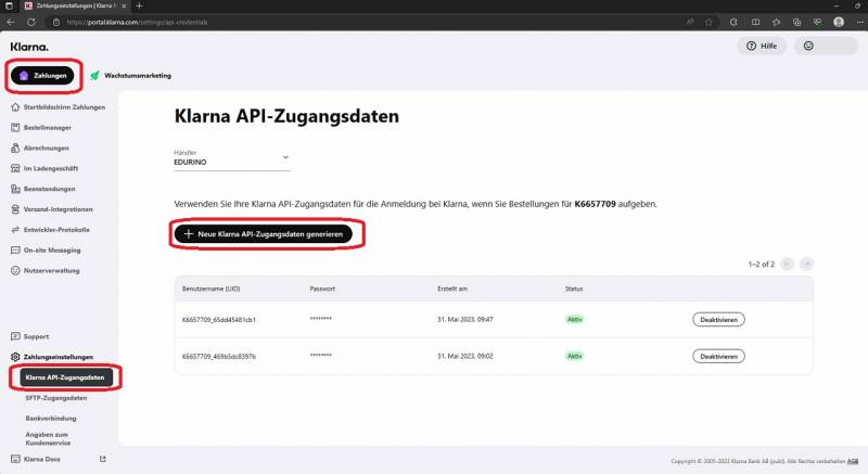 Bitte öffnen Sie nun die Schnittstelle und wählen Sie den Menüpunkt „KLARNA“ und wählen Sie die