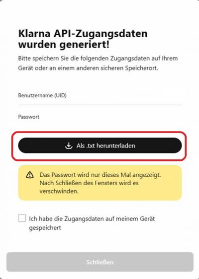 Sie erhalten die Meldung, dass die Zugangsdaten erstellt wurden und die Aufforderung, diese lokal