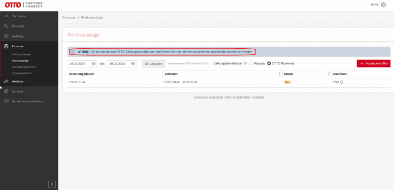 Bitte beachten Sie, dass Sie die Kontoauszüge für die Zahlungsdienstleister getrennt herunterladen und