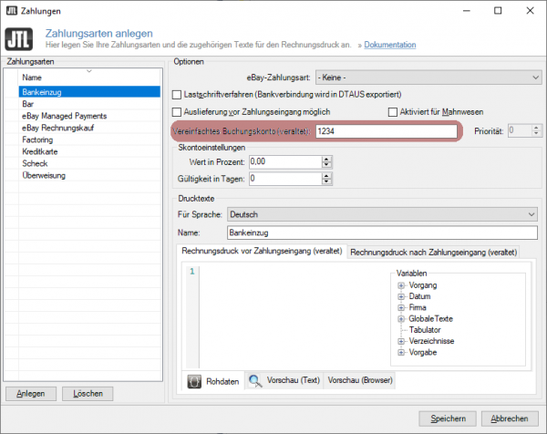 Diese Einstellung finden Sie in der JTL-Warenwirtschaft unter Zahlungen / Zahlungsarten → vereinfachtes Buchungskonto (veraltet).