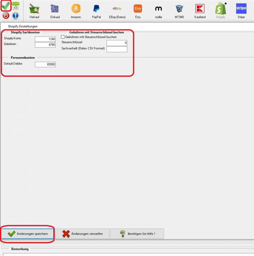 Gebühren: Bitte hinterlegen Sie ein Konto auf welches die Shopify-Gebühren verbucht werden sollen. Möchten Sie die Gebühren mit einem Steuerschlüssel buchen, aktivieren Sie bitte die entsprechende Checkbox und hinterlegen Sie in den Feldern „Steuerschlüssel“ den entsprechenden Steuerschlüssel und ggf. „Sachverhalt“ den entsprechenden Sachverhalt.