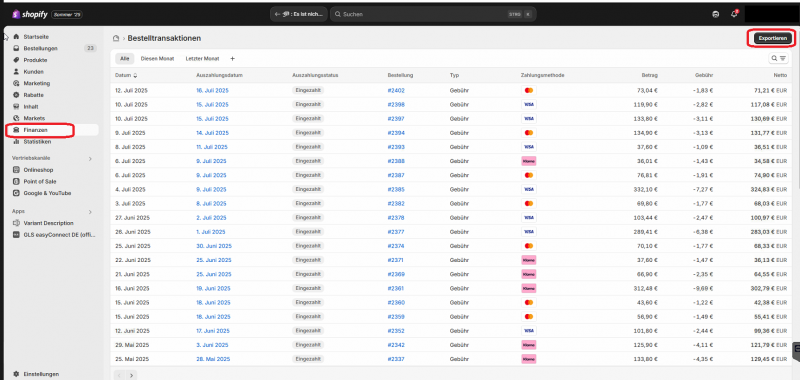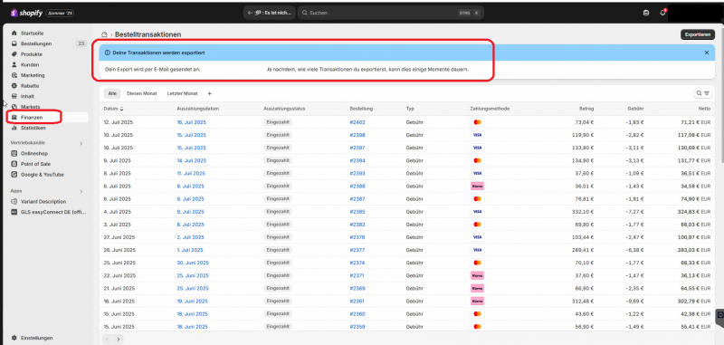 Buchungen dargestellt. Unverarbeitete Shopify-Zahlungen werden beim Erzeugen der Datei für die