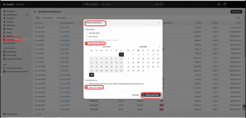 Bitte wählen Sie die Einstellung „Artikel nach Datum“, grenzen dann den Datumsbereich ein und wählen „reine CSV-Datei“