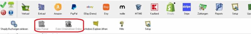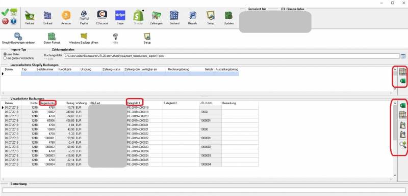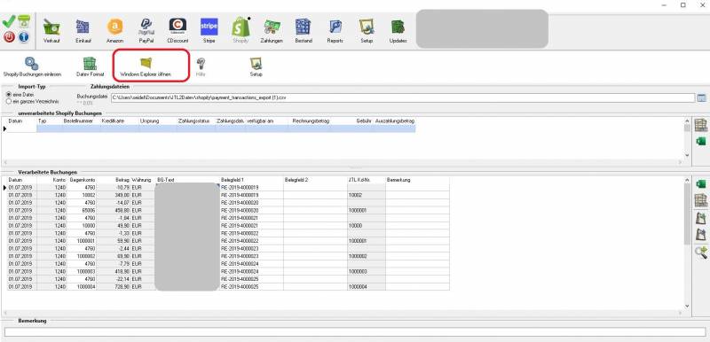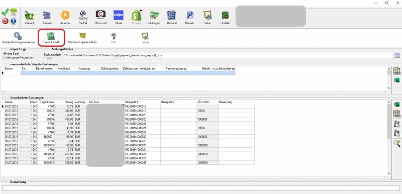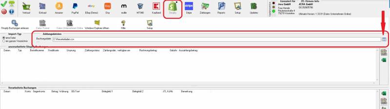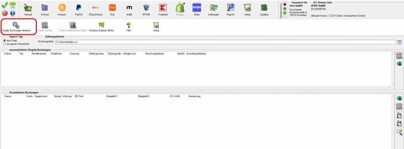 Anschließend lesen Sie die Datei über den Menüpunkt „Shopify Buchungen einlesen“ in die Schnittstelle ein (Abb. 9).