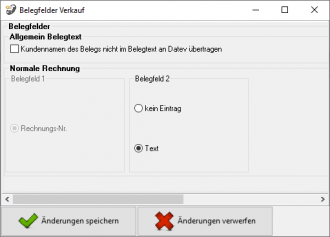 Legen Sie bitte hier den Inhalt der Belegfelder 1 und 2 fest. Erwartet Ihr DATEV-Mandant im Belegfeld 2 das Zahlungsziel, sollten Sie nur „kein Eintrag„ für das Belegfeld 2 wählen.
