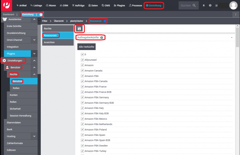 Wechseln Sie bitte nun in den Bereich „Ressourcen“ und aktivieren Sie unter der Funktion „Auftragsherkünfte“ die Option