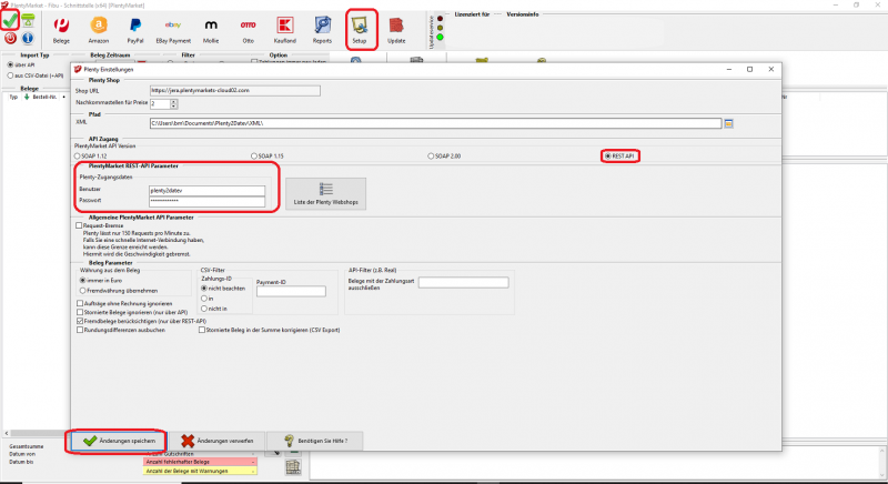 Den Namen des angelegten REST-API-Benutzers und das vergebene Passwort sind in der Schnittstelle „Plenty 2 Datev“