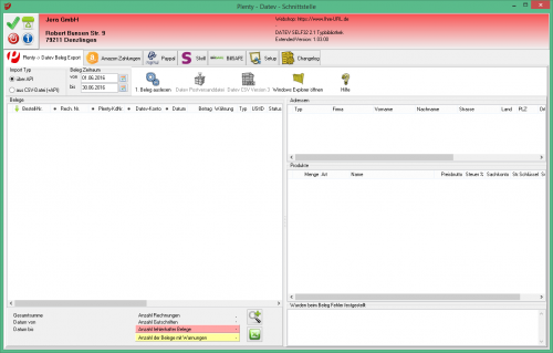 Die Schnittstelle liest über die die API die Belege aus der Plentymarkets Datenbank aus. Anschließend werden die Belege, so wie Sie exportiert wurden, in einem Archiv abgespeichert. Da die Plenty API nicht geeignet ist, um z.B. nach Zahlungen zu suchen, werden, wenn Sie die Amazon oder PayPal Zahlungen verarbeiten, die Belege nicht über die Plenty API gesucht, sondern in dem Archiv der Schnittstelle. Wenn also die Schnittstelle Zahlungen aus dem z.B. Februar verarbeiten soll, müssen Sie auch schon einmal die Belege für den Februar eingelesen haben. Sie müssen dies nicht jedes Mal tun, bevor Sie die Zahlungen verarbeiten. Die Schnittstelle merkt sich diese Belege auch dann, wenn Sie die Schnittstelle schließen. Da meist für einige Zahlungen aus dem Februar, die Rechnungen erst im März erstellt werden, sollten Sie auch die Belege aus dem März einlesen. Sie müssen hierbei nicht unbedingt einen Datev Export erstellen, es reicht, wenn Sie die Belege mit dem Button „Belege auslesen“ in die Schnittstelle und damit in das Archiv einlesen.