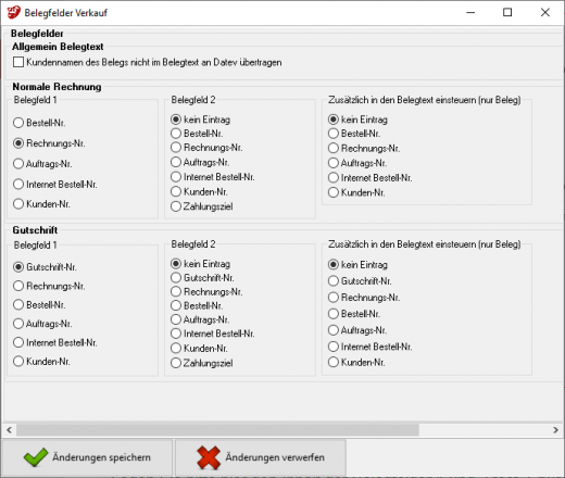 Legen Sie bitte hier den Inhalt der Belegfelder 1 und 2 fest. Außerdem können Sie verschiedene zusätzliche Informationen in den Belegtext einsteuern. Setzen Sie hierzu den Radiobutton auf den gewünschten Wert.