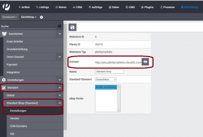 „Mandant / Standard Shop / Einstellungen“ und dann unter der Bezeichnung „Domain“