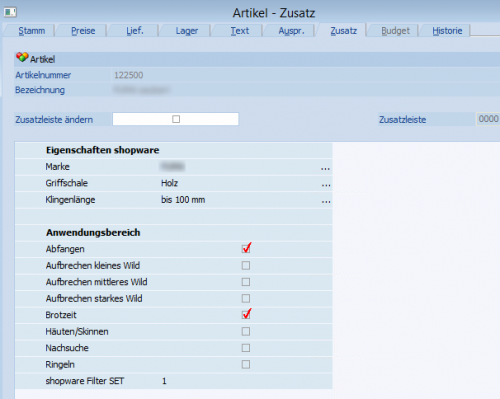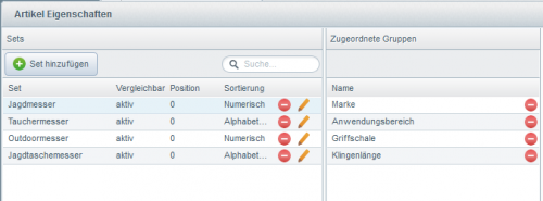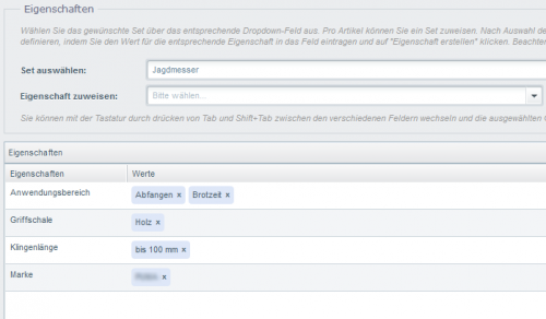 Hier wurde dem (Filter) Set „Jagdmesser“ die Eigenschaften „Marke“, „Anwendungsbereich“, „Griffschale“ und „Klingenlänge“ zugeordnet.