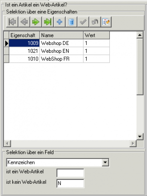 In diesem Fall hat der Kunde unterschiedliche Shops und es werden alle Artikel selektiert, die in den Eigenaschaften „WebShop DE“, „WebShop EN“ und „WebShop FR“ den Wert 1 gesetzt haben.