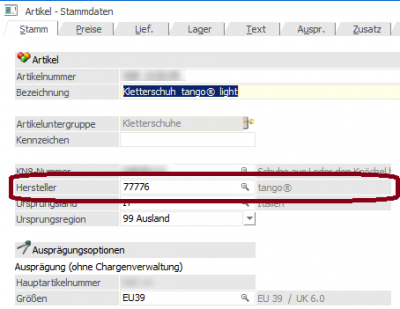 Der Hersteller des Artikels wird in der Winline im Artikel festgelegt: