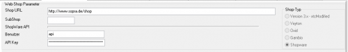 Tragen Sie hier die URL Ihres Shops und die Zugangsdaten ein. Im nächsten Abschnitt wird beschrieben, wie an einen API Schlüssel für den Zugriff der Schnittstelle erstellt.