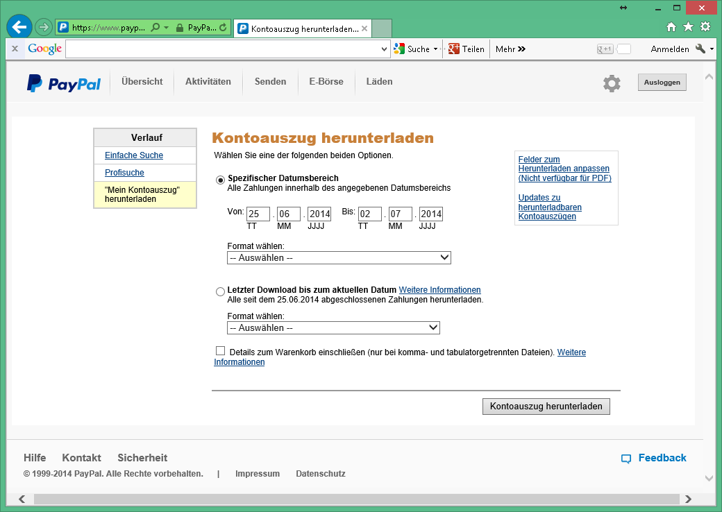 Sie befinden sich hier: Wiki für die Fibu-Schnittstellen der Jera GmbH » paypal » PayPal Kontoauszug im älteren Design-Varianten : design2-auszug.png