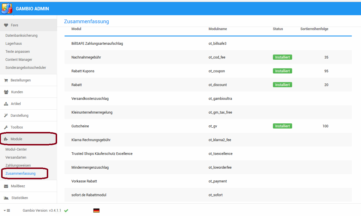 Sie befinden sich hier: Wiki für die Fibu-Schnittstellen der Jera GmbH » xtc » datev » Sachkonten Verkauf : gambioadminmodule.png