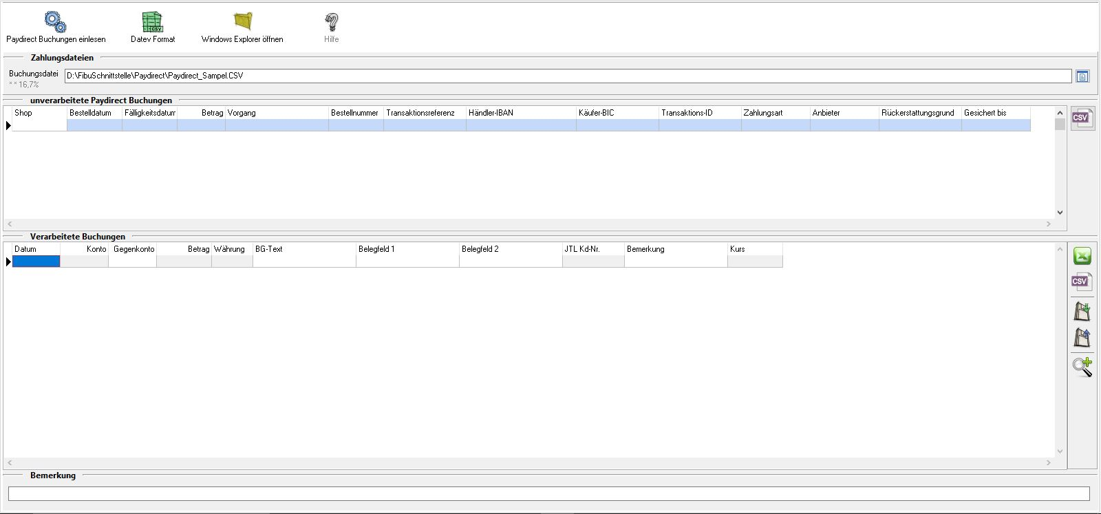 Sie befinden sich hier: Wiki für die Fibu-Schnittstellen der Jera GmbH » Belege in die Schnittstelle einlesen » paydirect » Import Paydirect Kontoauszug : paydirectimport1.png