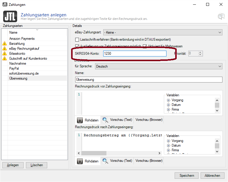 Sie befinden sich hier: Wiki für die Fibu-Schnittstellen der Jera GmbH » Belege in die Schnittstelle einlesen » Zahlungen eines Zeitraums : jtlpaymenttypeledger.png