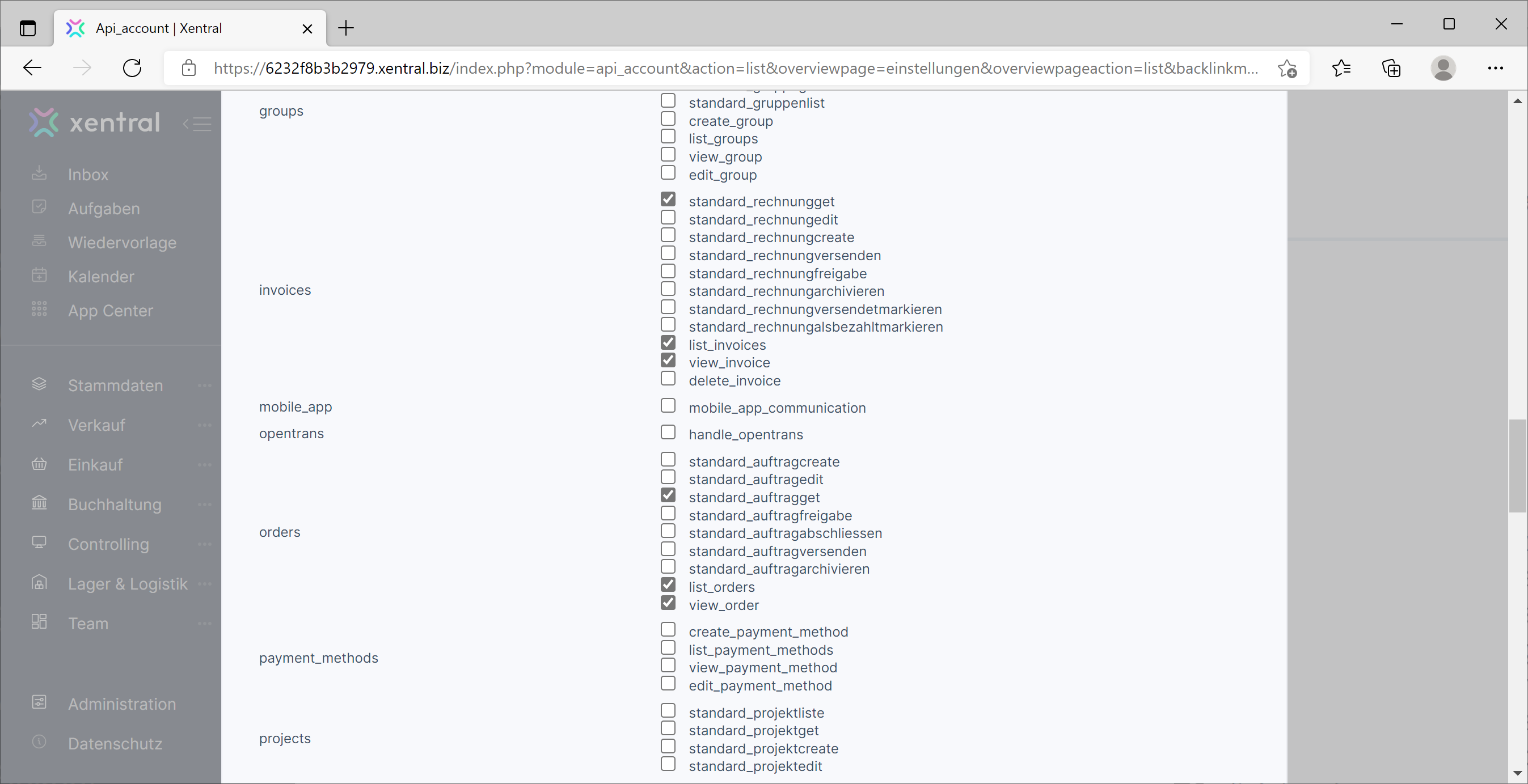 Sie befinden sich hier: Wiki für die Fibu-Schnittstellen der Jera GmbH » xentral » Vorbereitungen in Xentral : createapiuserrights1.png